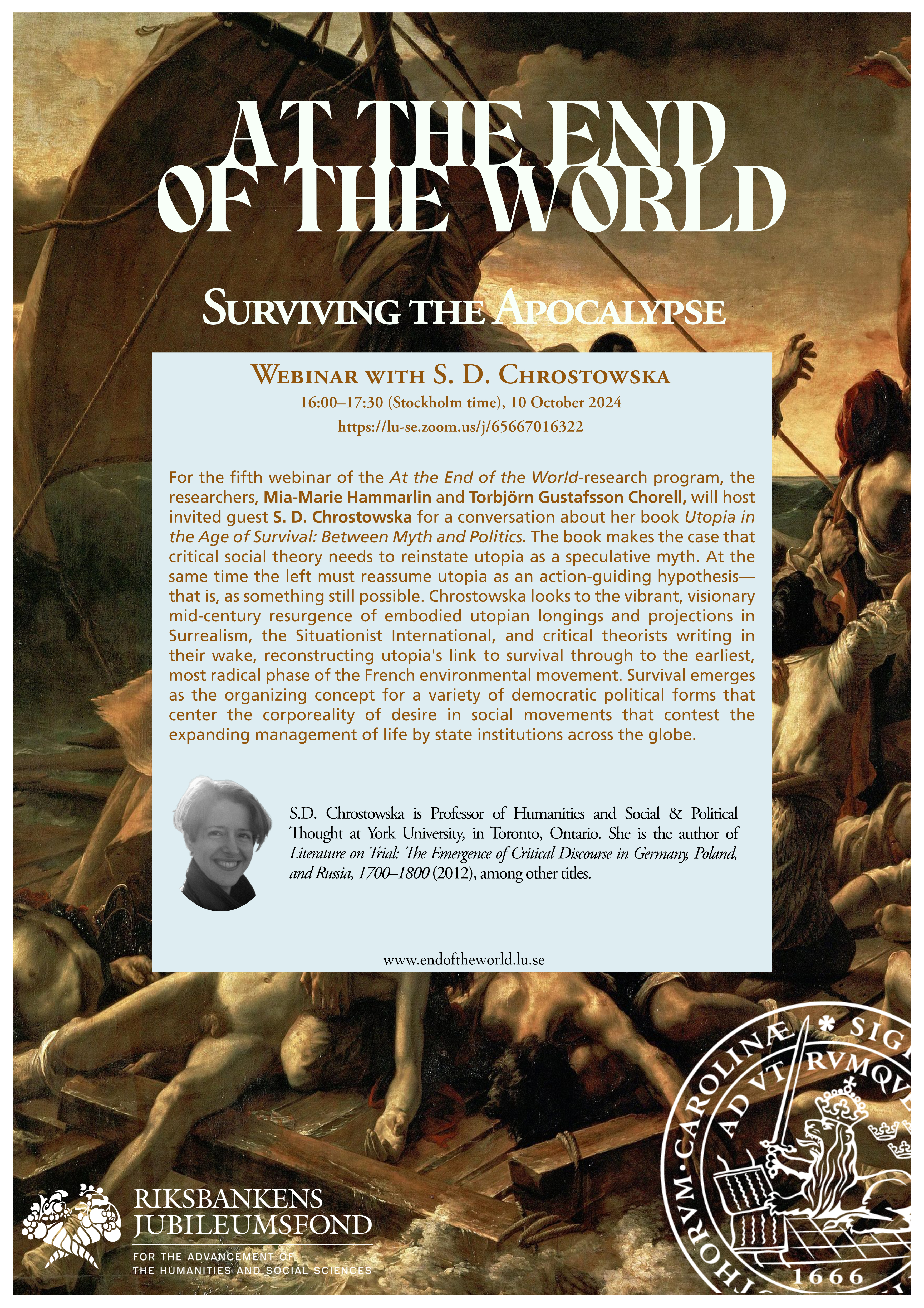 -------------------------------------------------------------------------------------------- | Webinar iv: Surviving the Apocalypse - 16:00-17:30, 10 October 2024 https://lu-se.zoom.us/j/65667016322 For the fifth webinar of the At the End of the World research program, the researchers Mia-Marie Hammarlin and Torbjörn Gustafsson Chorell will host invited guest S. D. Chrostowska for a conversation about her book Utopia in the Age of Survival: Between Myth and Politics. The book makes the case that critical social theory needs to reinstate utopia as a speculative myth. At the same time the left must reassume utopia as an action-guiding hypothesis—that is, as something still possible. S.D. Chrostowska is Professor of Humanities and Social & Political Thought at York University. She is the author of Literature on Trial: The Emergence of Critical Discourse in Germany, Poland, and Russia, 1700-1800 (2012), among other titles. | | |